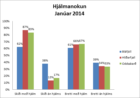 Flestir voru með hjálm í Hlíðarfjalli 87% og litlu færri í Oddsskarði eða 83% en í Bláfjöllum aðeins 62%. Brettafólk notar síður hjálm sem er mjög miður því það tekur yfirleitt mun meiri áhættu við æfingar sínar en skíðafólk. Lítill munur var á milli svæða.